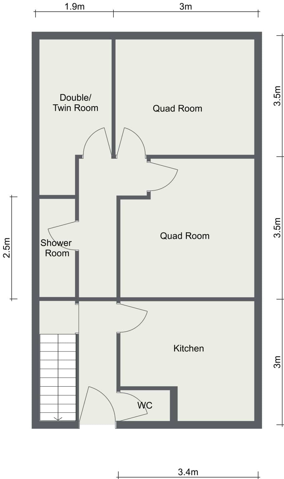 - Trois chambres, dont deux chambres quadruples avec lits superposés (qui peuvent être remplacés par des lits simples ou doubles sur demande) et une chambre double/jumelle.