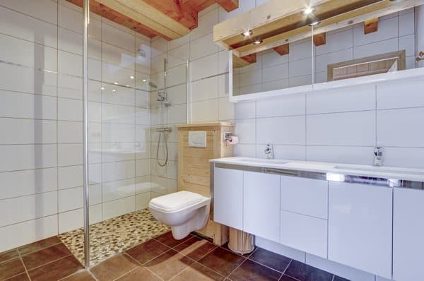 - A spacious bathroom equipped with a walk-in shower, basin, and toilet.