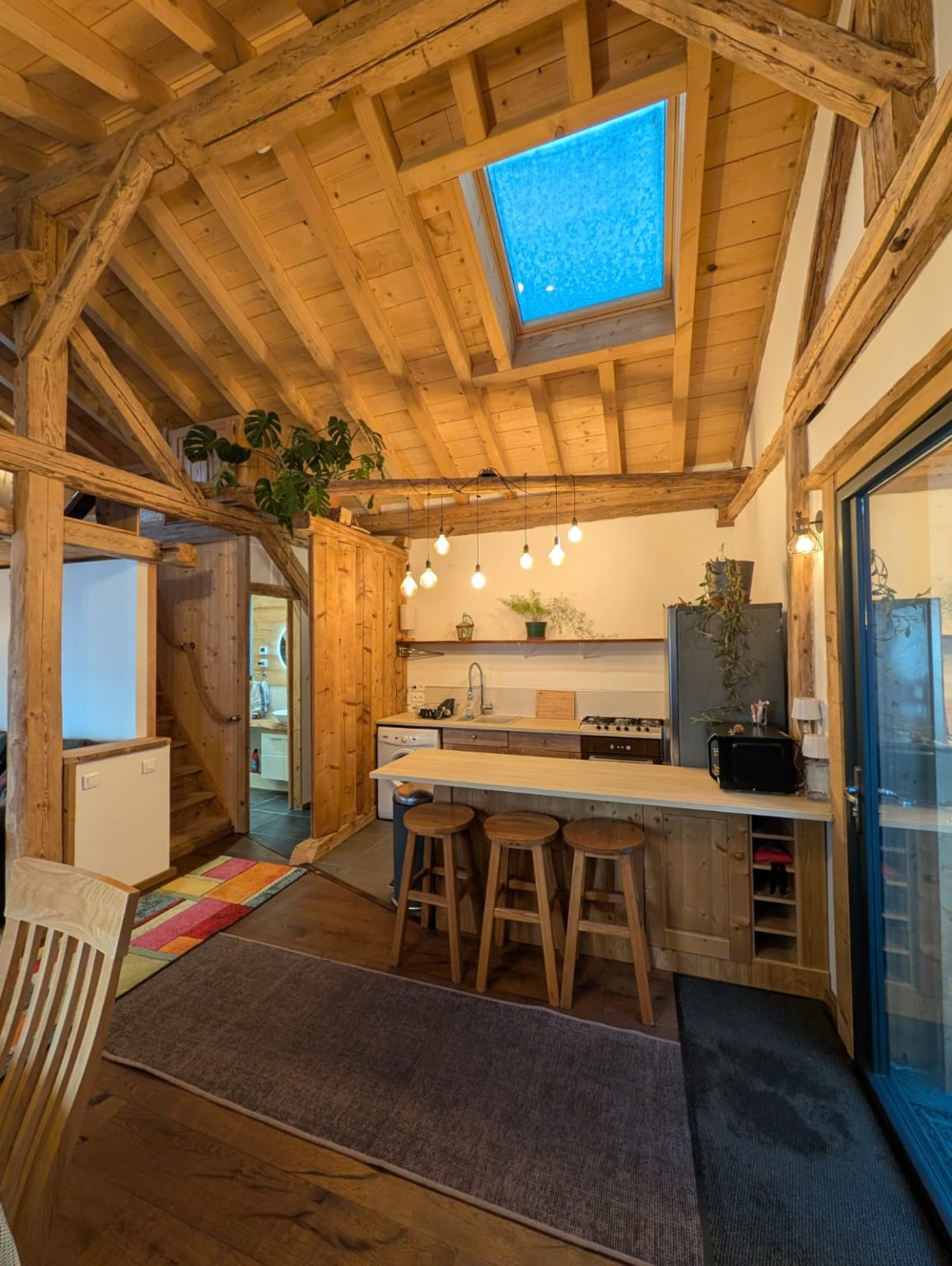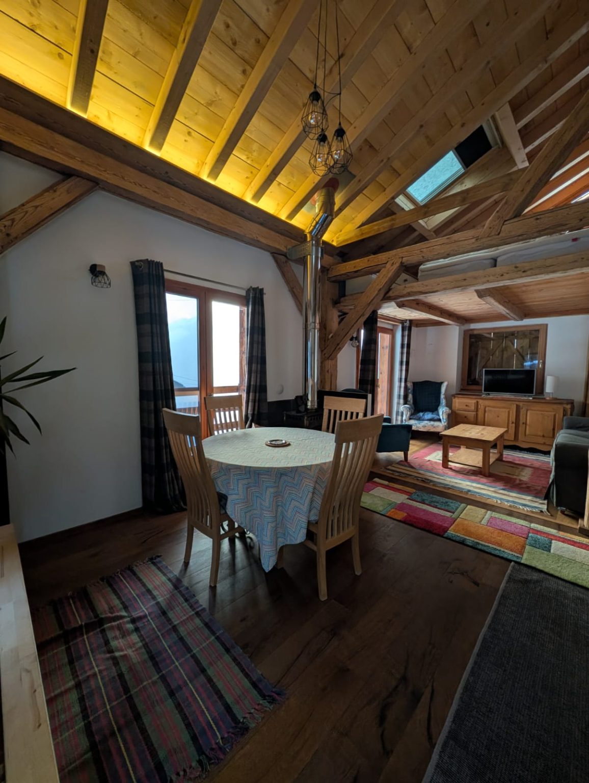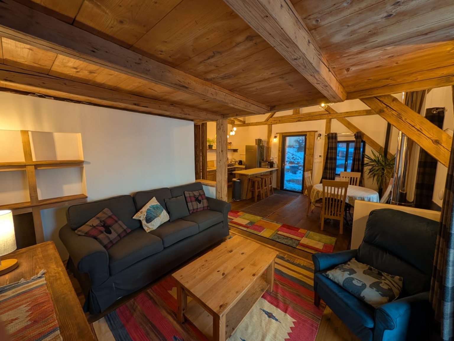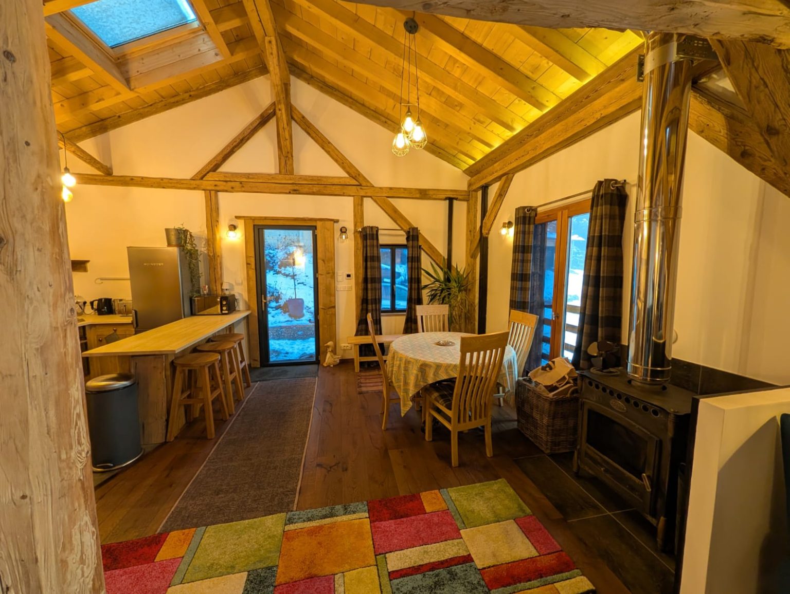 A cosy, well-equipped space perfect for a couple. The Bothy features underfloor heating, a wood-burning stove, Starlink internet, a washing machine, and a brand-new fridge/freezer. Sleeping options include a mezzanine with either two singles or a Super-King double, an additional coin montagne if needed, and a sofa bed. Guests also benefit from a dedicated ski-boot room and stunning south-facing views of the Roc d’Enfer